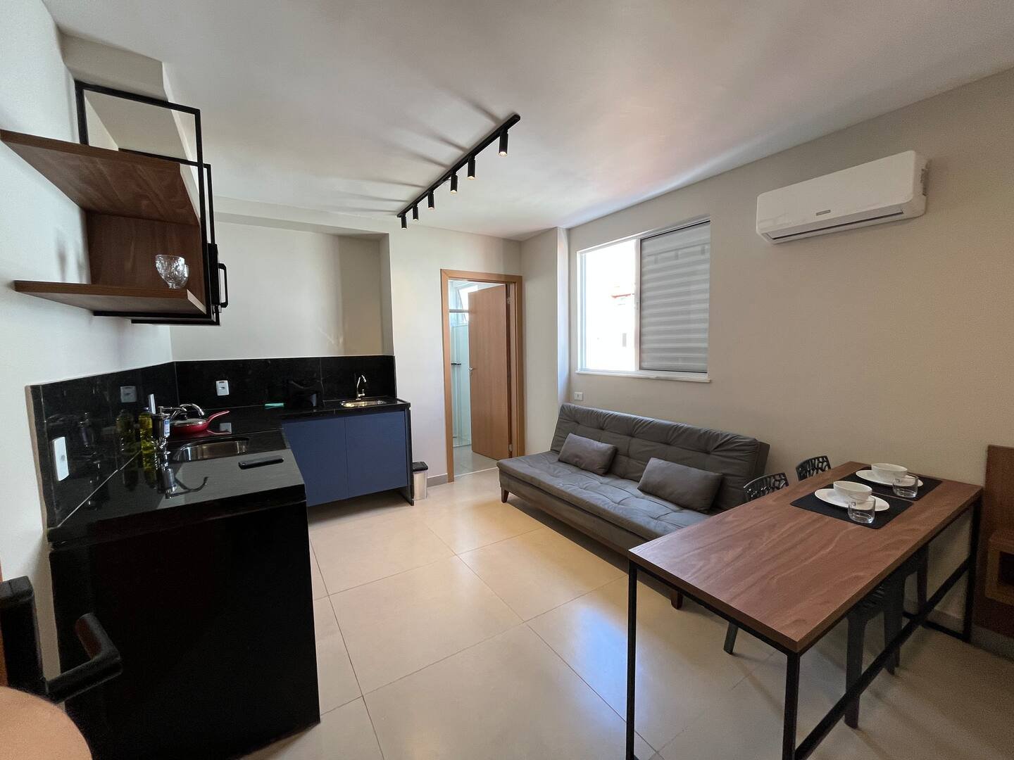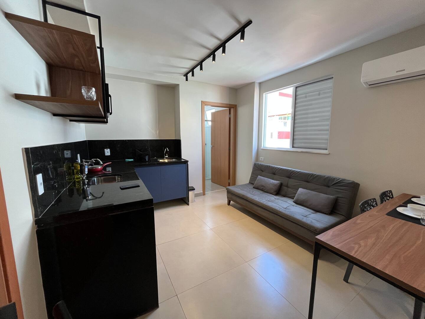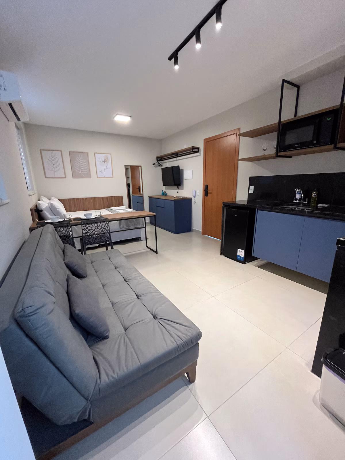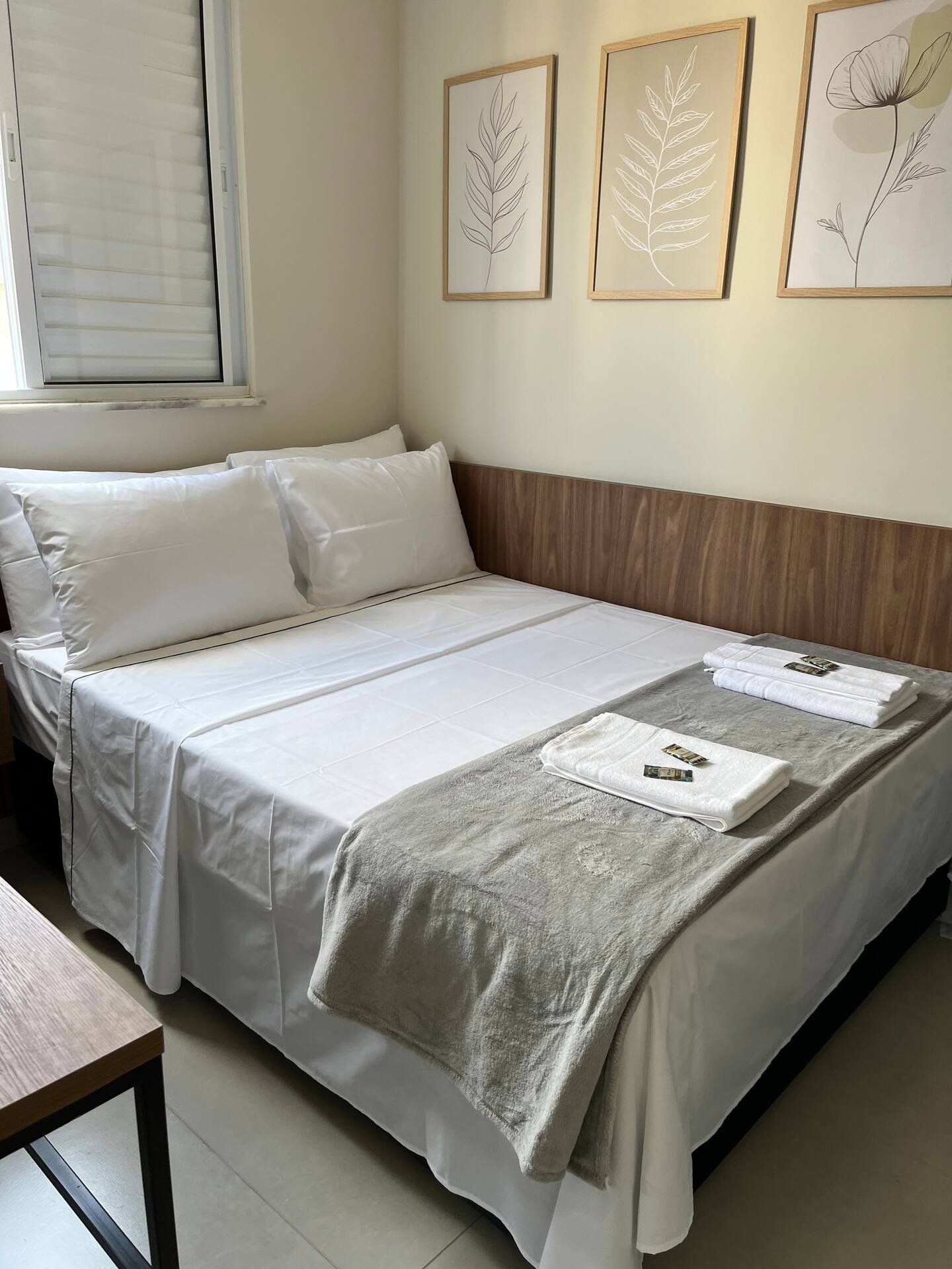Apartamento novo e moderno, elevador, cômoda, tv smart, cama box, enxoval cama e banho, manta de microfibra, bancada/aparador, banheiro privativo, pequena cozinha/copa, frigobar, ar condicionado, cafeteira, fogão elétrico indução 1 boca, microondas, secador de cabelo, ferro de passar roupas, sofá.