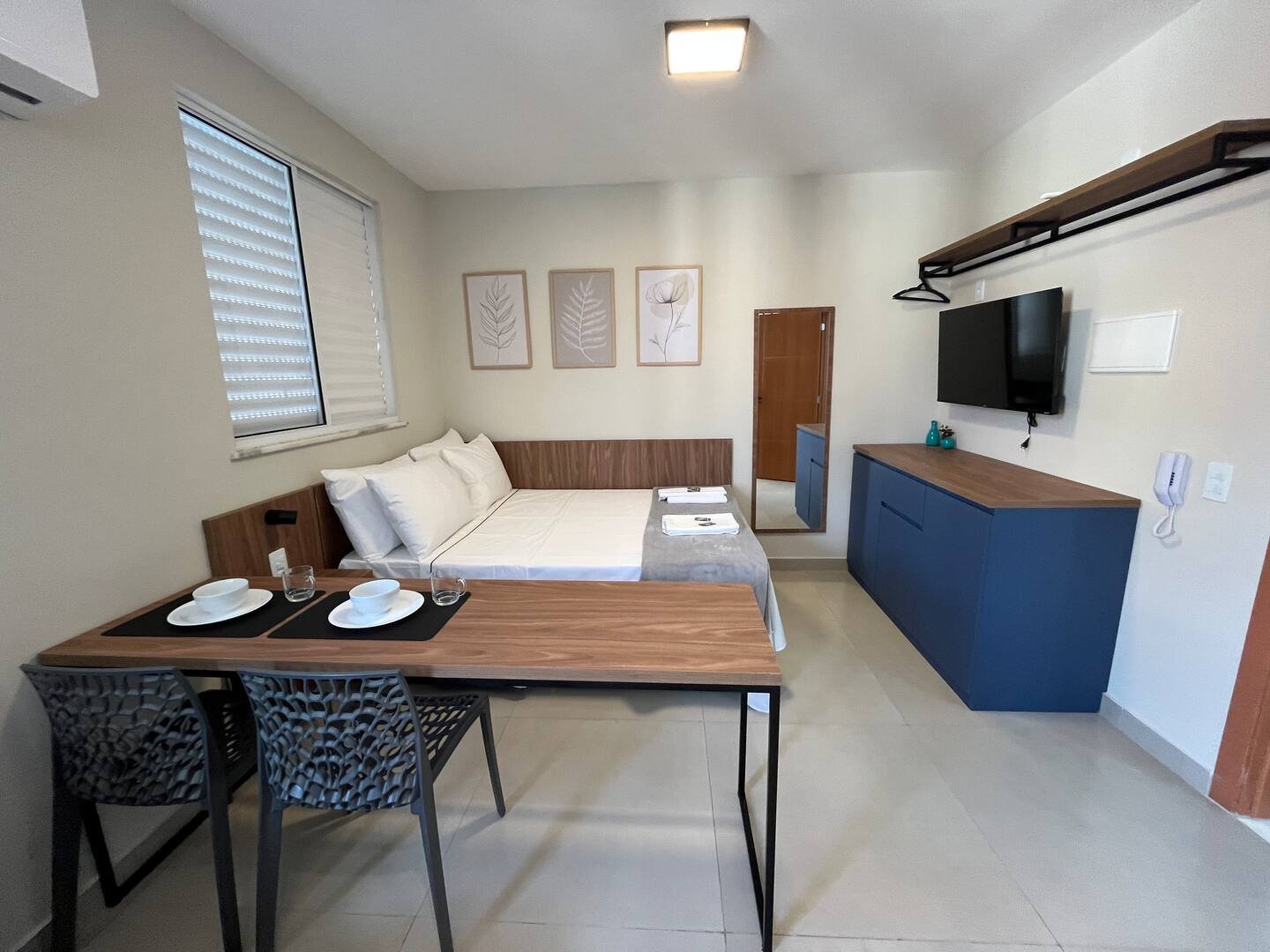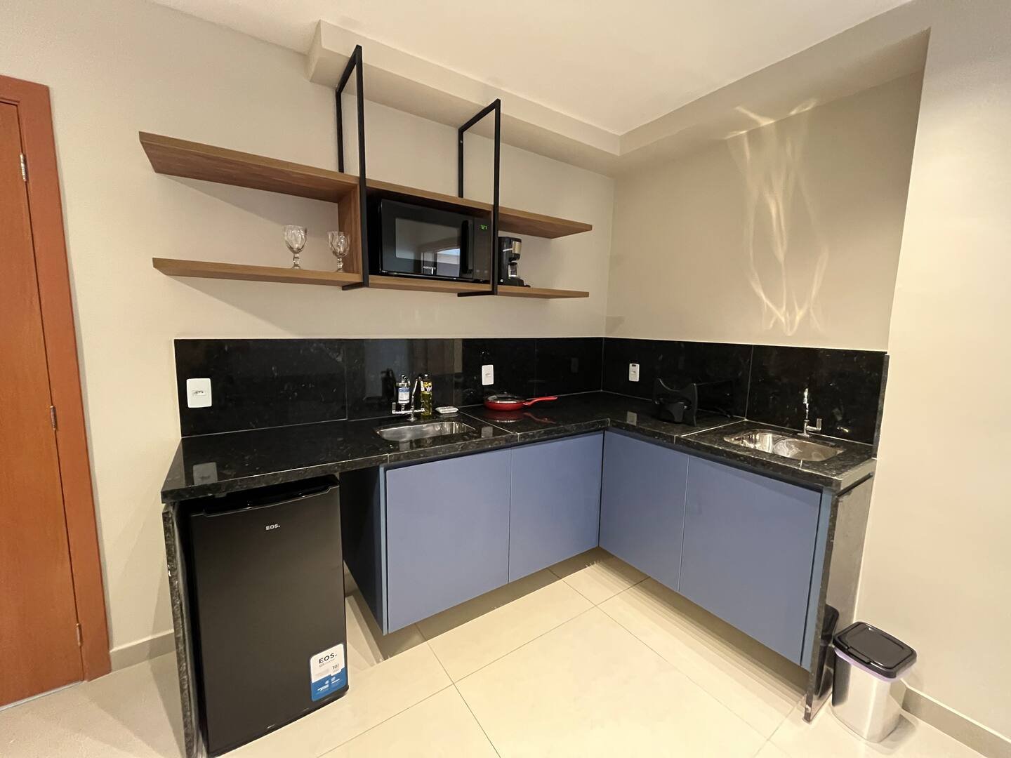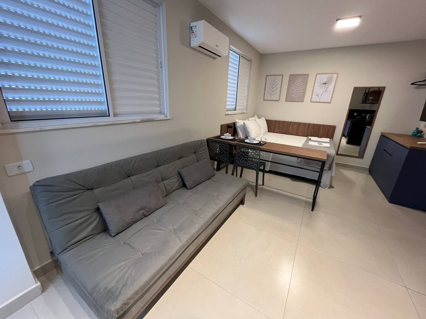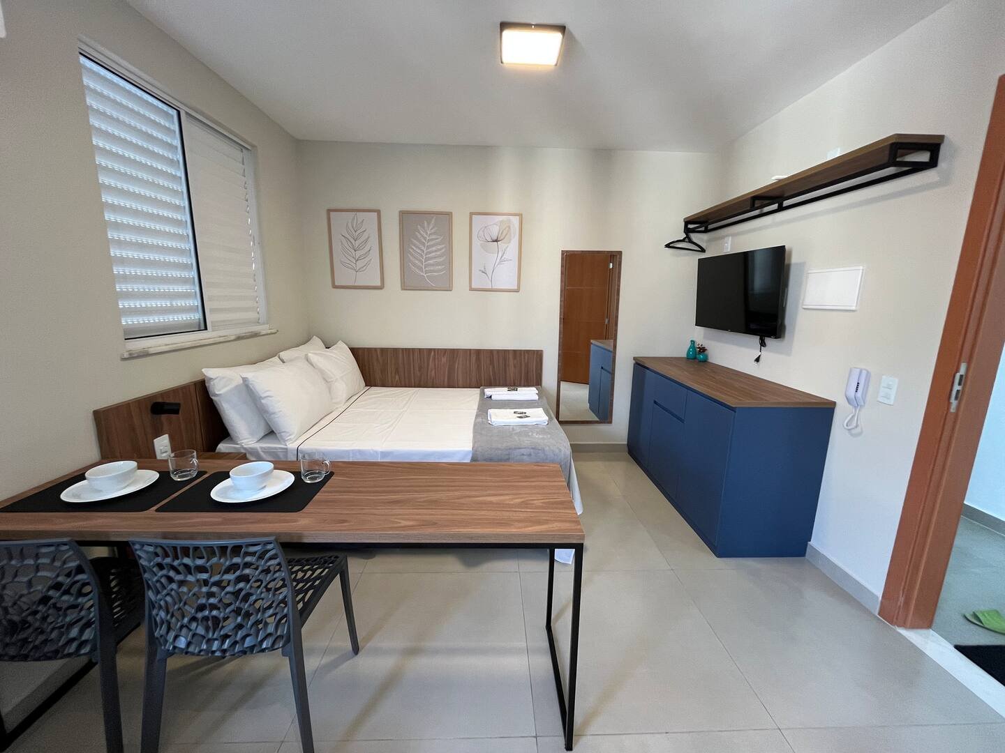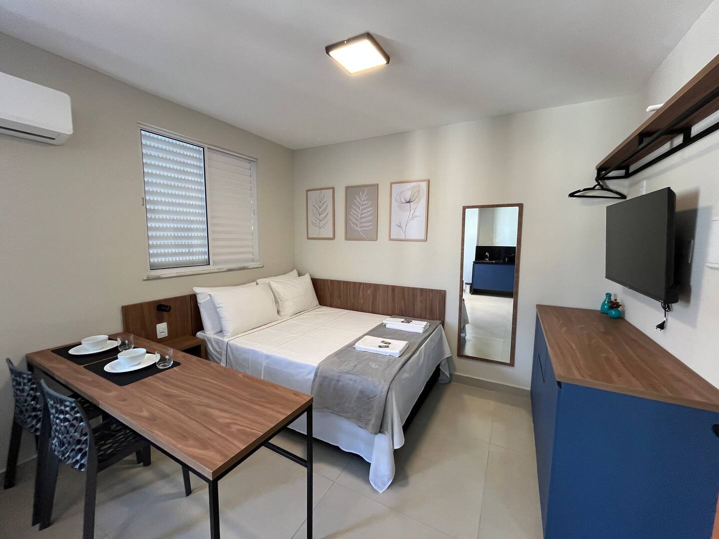 Apartamento novo e moderno, elevador, cômoda, tv smart, cama box, enxoval cama e banho, manta de microfibra, bancada/aparador, banheiro privativo, pequena cozinha/copa, frigobar, ar condicionado, cafeteira, fogão elétrico indução 1 boca, microondas, secador de cabelo, ferro de passar roupas, sofá.
